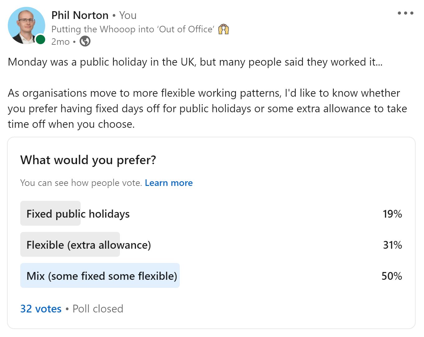 Before we dive into the results, let's be clear: this was no scientific survey. With a mere 32 votes, it's safe to say that I can't claim to have captured the entire nation's thoughts on the matter. However, the results provide some food for thought and suggest that companies should consider their options regarding bank holidays and whether offering more flexibility could be well received by employees.