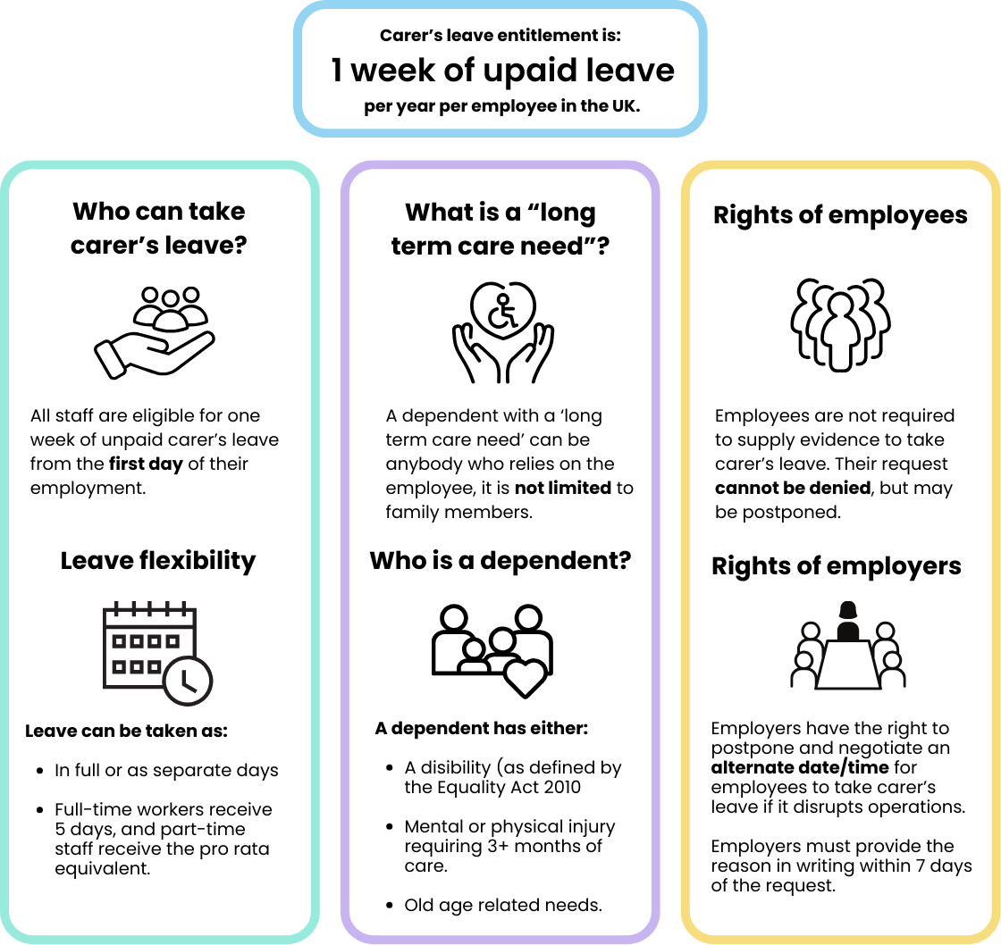 The Act came into force in April 2024, and requires all employers in the UK to provide up to a week’s unpaid leave per year to any employee who provides care to a ‘dependent’ with a ‘long-term care need’. The provisions outlined in the act are available to all employees from their first day of employment. There is no requirement that carer's leave be taken in a whole week block, employees can opt to take time off in full days or half days.