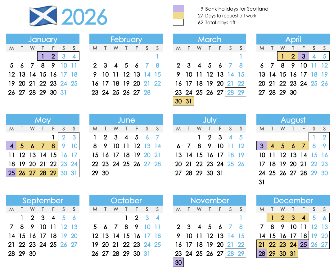 This means the Scots can get 62 days off work by requesting 27 days of annual leave.