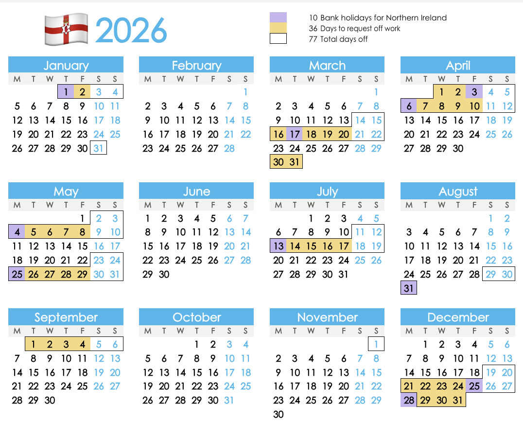In Northern Ireland, you can get 77 days off work by requesting 36 days of leave, as you have ten bank holidays in 2026: