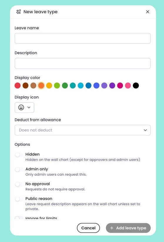 Each leave type has pre-set colours, but you can change these any time in your admin account: