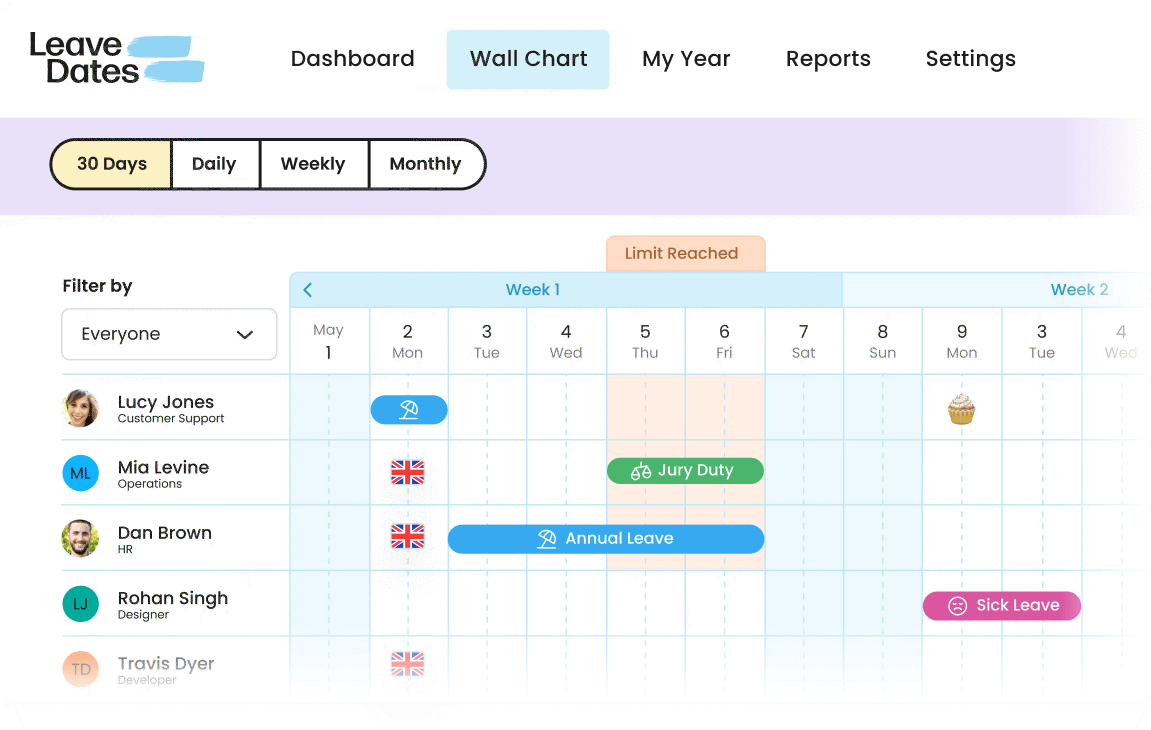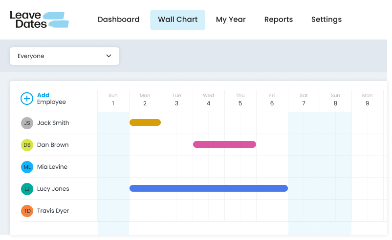 To make our leave type bars bolder and easier to distinguish on the wall chart, we have upgraded our colour palette. We aim to improve visibility for all customers, whether you're managing leave for a large team, or just checking a small department.