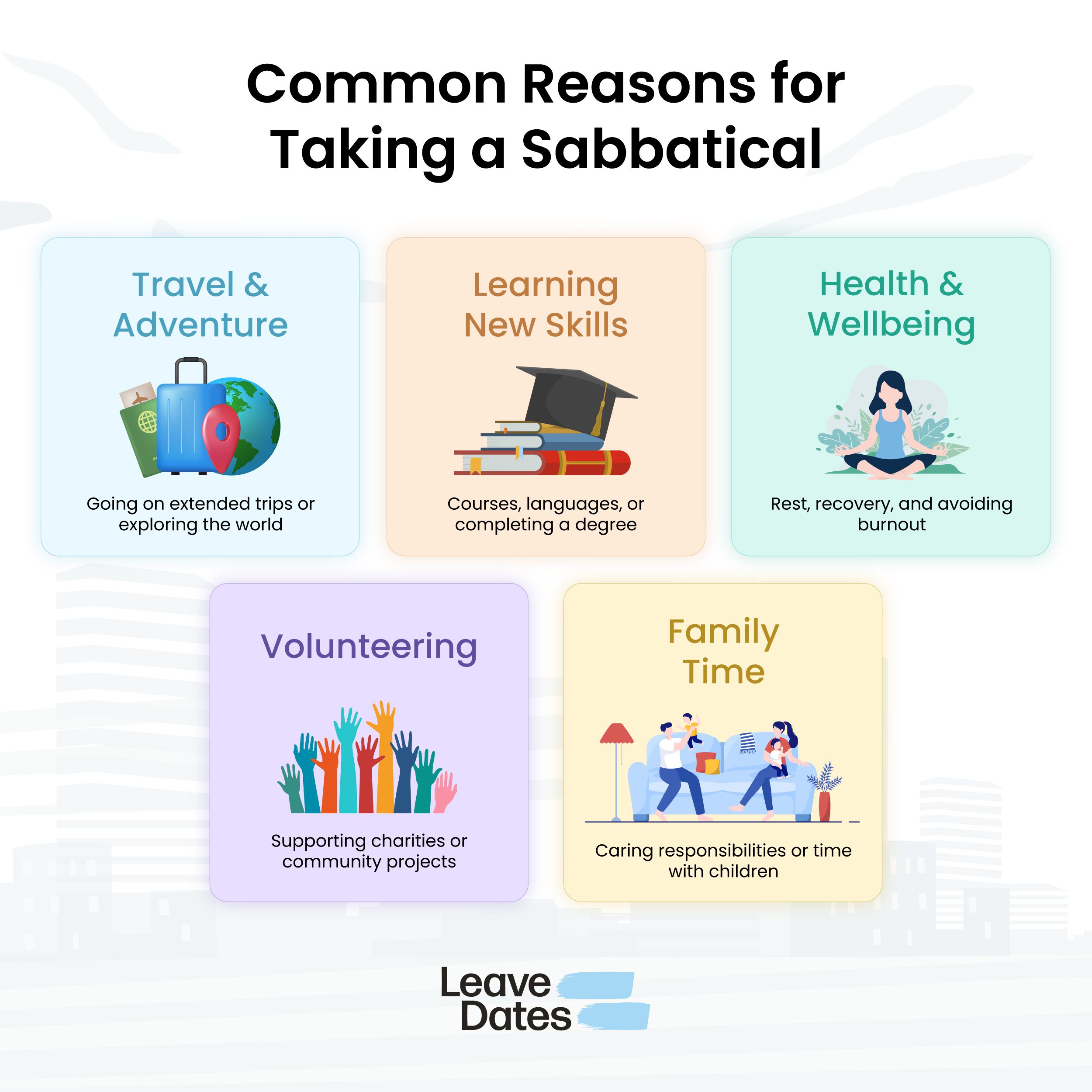- Health and wellbeing: Taking a break simply to rest, avoid stress or recover from burnout.