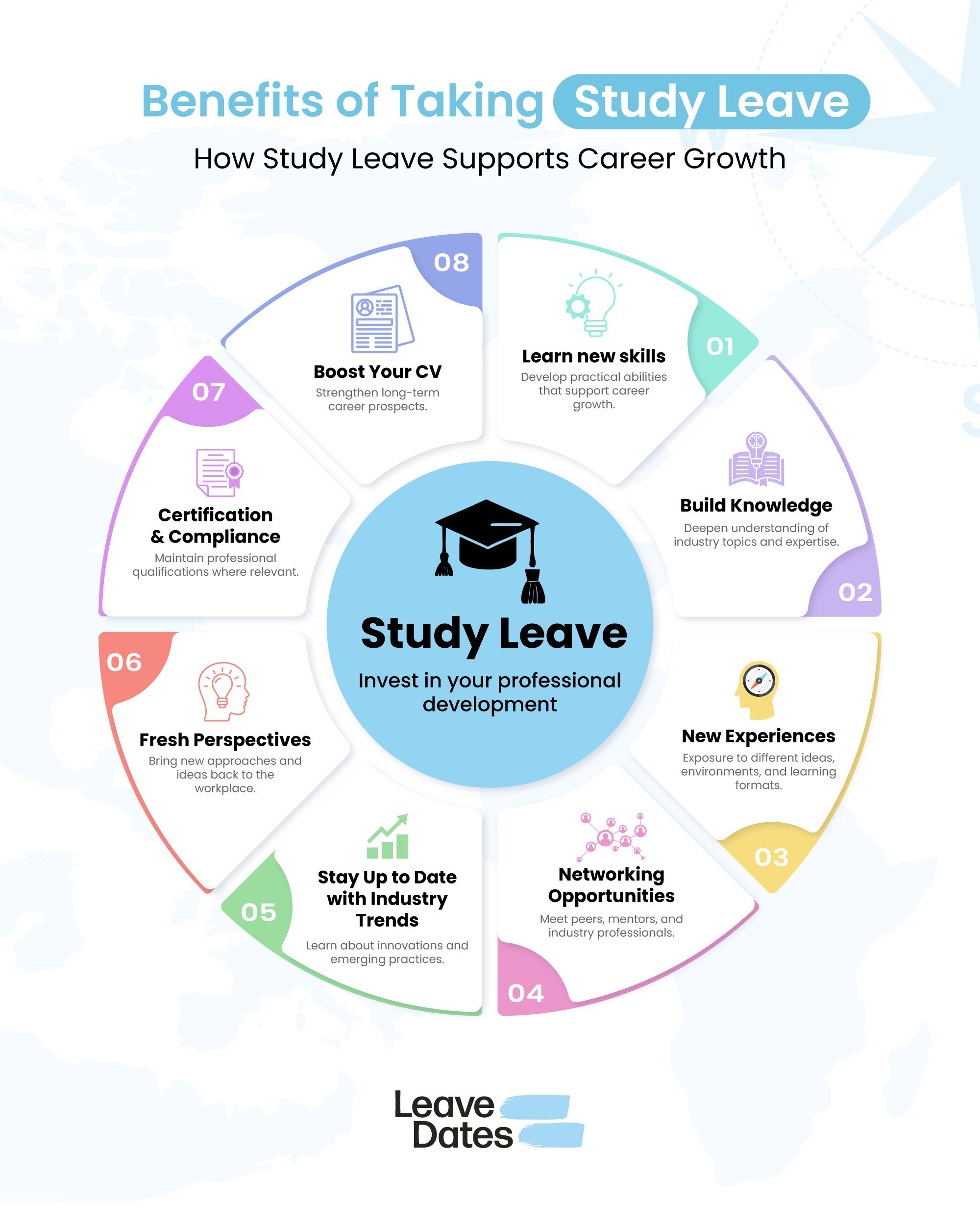 Study leave is time off with the specific purpose of studying or training. It can be used to complete courses, attend workshops, conferences or seminars, training to acquire a specific skill or certification or take study days. It can also be a longer-term sabbatical aimed at personal and professional growth.